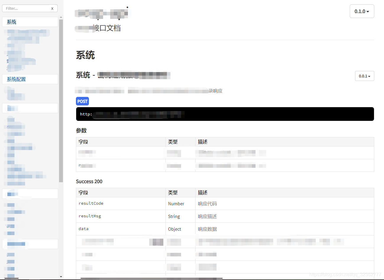 /** * @api {post} /urlDemo 示例接口名称 * @apiGroup 系统 * @apiVersion 0.0.1 * @apiDescription 示例接口描述 * @apiParam {String} param1 请求参数1 * @apiParam {Object} param2 请求参数2(JSON数据) * @apiParam {String} param2.name 请求参数3(属于请求参数2的一个属性) * @apiParam {Number} [param4] 请求参数4 * @apiUse ResponseBody * @apiSuccess {Object} data响应数据描述 * * @apiError _SESSION_EXPIRED 会话已过期 * @apiErrorExample {json} _SESSION_EXPIRED * HTTP/1.1 200 OK * { * "resultCode": -13, * "resultMsg": "会话已过期", * data: null * } * @apiUse ResponseBody */@PostMapping(value = "/urlDemo")public void urlDemo (@RequestBody Map<String, String> params){// ..}apiDoc参数目录