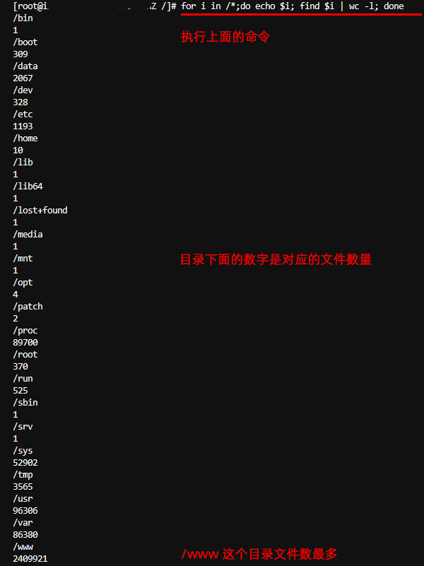 1、检查根目录下哪个文件夹占用磁盘,找到占用较多磁盘的文件夹,再单独进行排查。